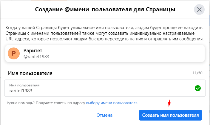 Внимание! Имя пользователя может быть занято. Поэтому нужно будет подбирать имя. Вводим имя и нажимаем "Создать имя пользователя".