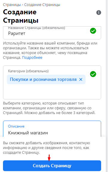 Добавляем описание страницы и нажимаем кнопку "Создать страницу".