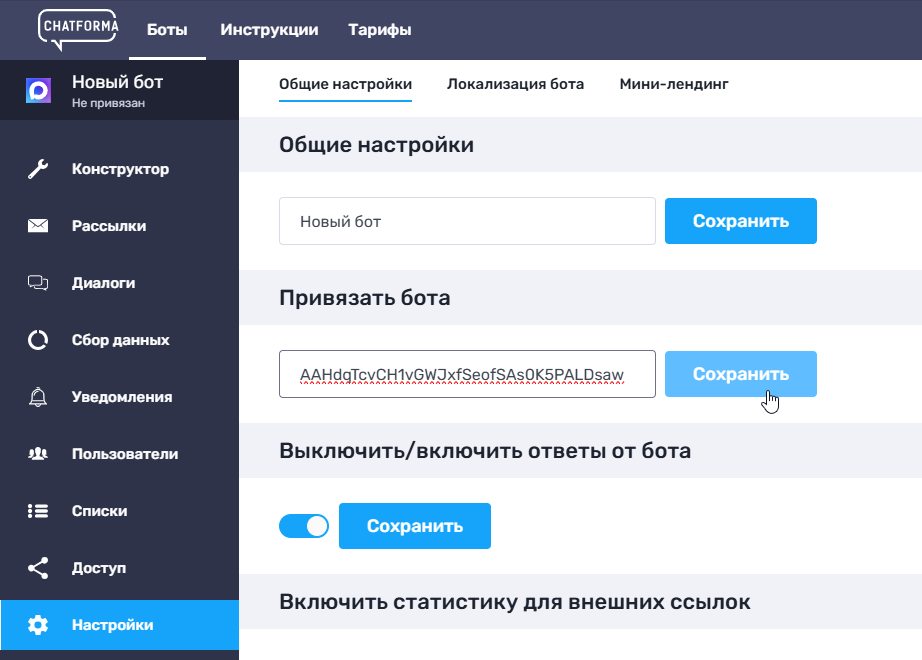 Теперь можно подключать бота к конструктору и настраивать его под свои задачи.