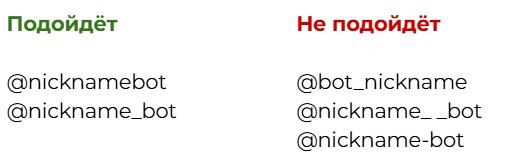 - Прибавьте к нику обязательное окончание «bot» — слитно или через одно нижнее подчёркивание. Другие символы использовать нельзя. Готовый ник должен выглядеть примерно так: nicknamebot или nickname_bot