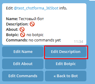 Шаг 3: Добавляем описание. Это то сообщение, которое ваши пользователи будут видеть до нажатия на кнопку "Начать" в вашем боте. Это описание будет прямо по центру экрана.