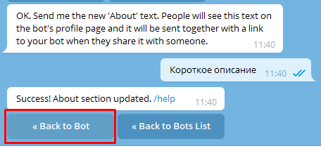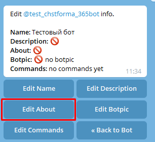 Шаг 4: Заходим в раздел about. Прописываем короткое описание вашего чат-бота.