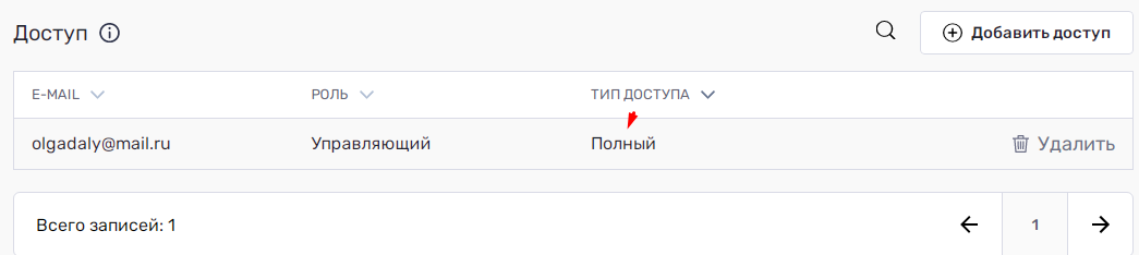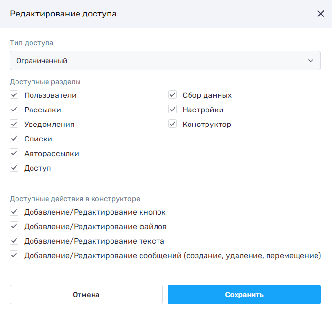 В типе доступа "Ограниченный" можно ограничить или выдать доступ управляющему к определенным разделам, убрав или поставив галочку.