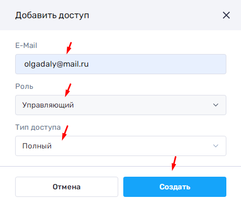 Шаг 2: Вводим email управляющего - выбираем роль "Управляющий" - тип "Полный". И нажимаем "Создать".
