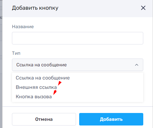 Шаг 4: Также можно создать кнопки с типом "внешняя ссылка" и "кнопка вызова". Тип внешняя ссылка - указываем URL внешнего сайта. Тип кнопка вызова - вводим номер телефона.