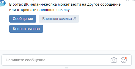 В ботах ВК инлайн-кнопка может вести на другое сообщение, открывать внешнюю ссылку, быть кнопкой вызова - выводить в переписку заданный номер телефона.