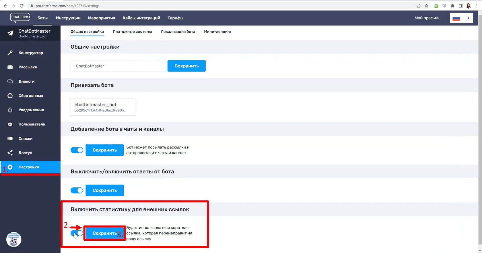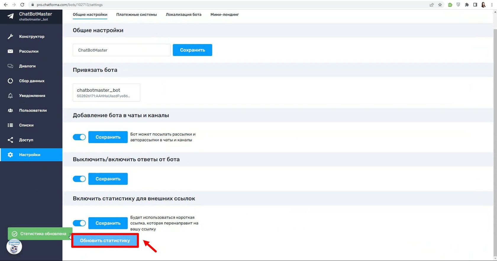 Шаг 4: Снова перейдите в настройки бота, нажмите кнопку Обновить статистику.