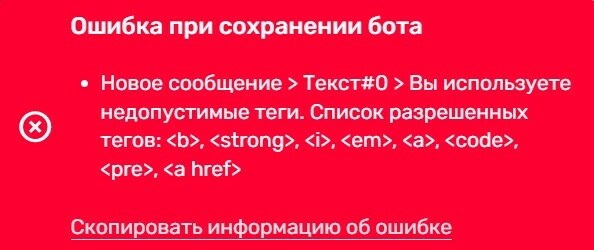 Важно! Обязательно проверяйте составленный текст. Если в тегах будут допущены ошибки: пробел между символами тега или между словом и тегом, лишний символ, то сообщение от бота не будет доставлено. Если в текст добавить другие коды, кроме указанных, то появится сообщение об ошибке: