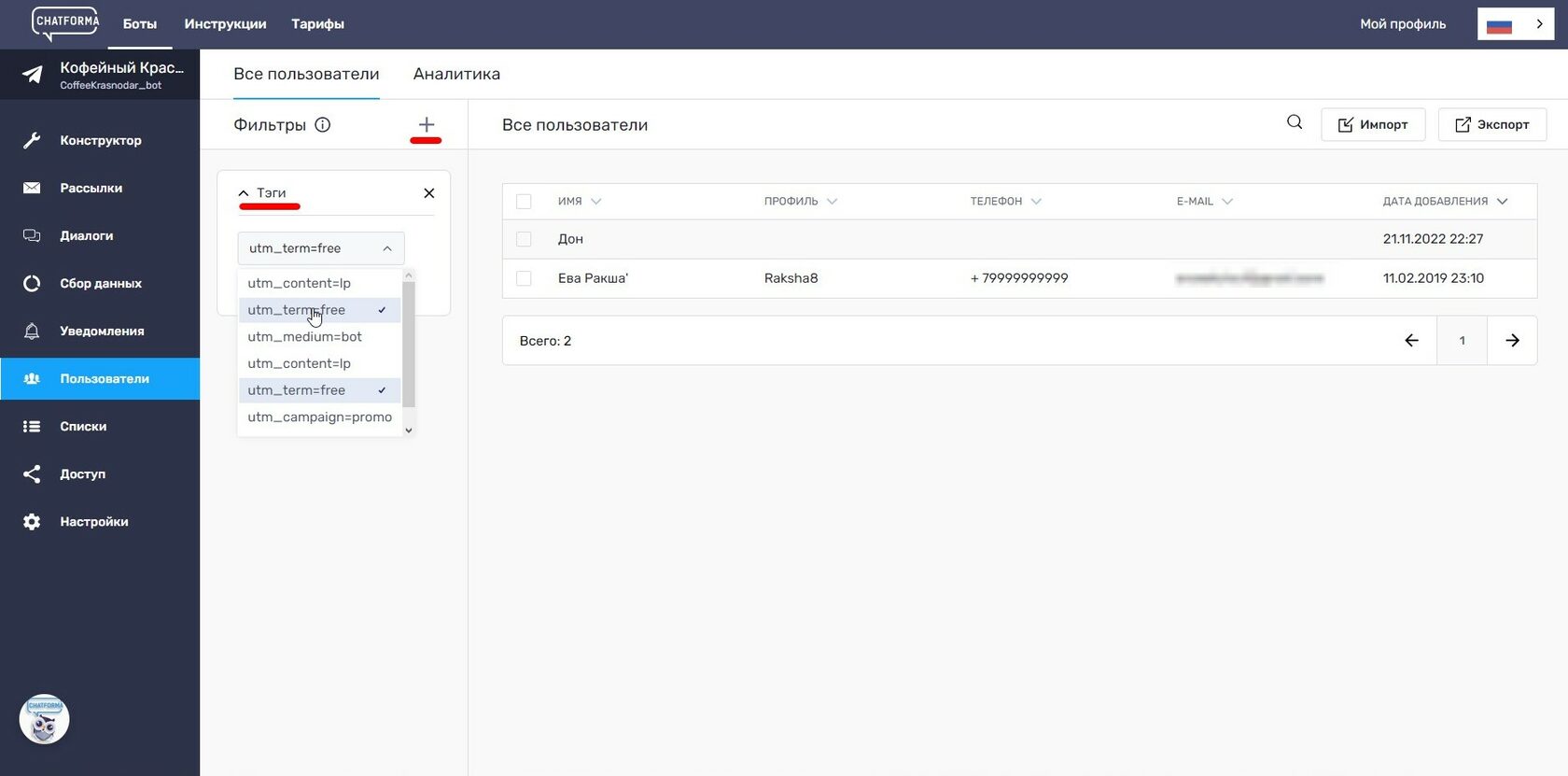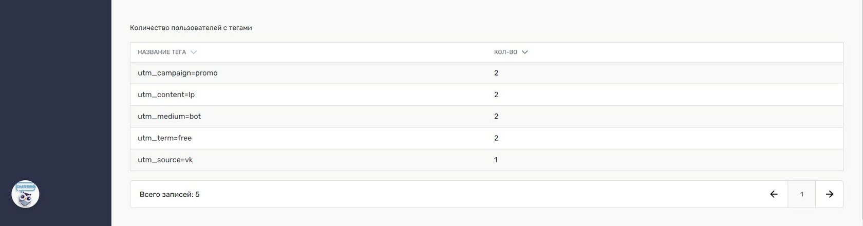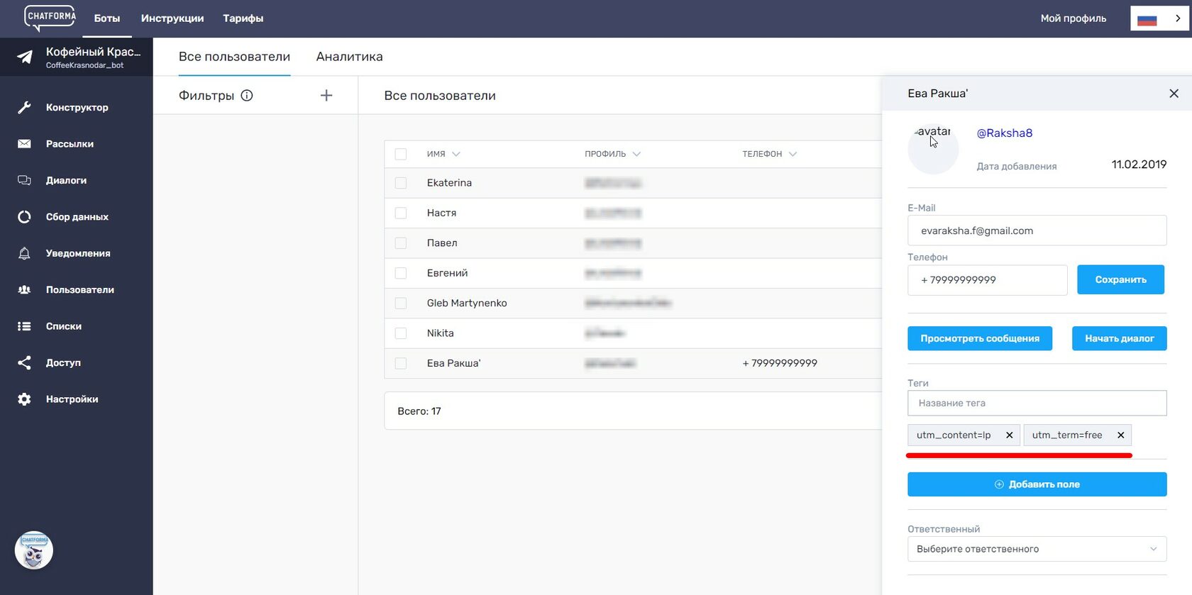 ?&utm_term=free После того, как пользователь запустит бот по такой ссылке с utm–метками, все указанные в ней метки будут занесены в теги пользователя. Далее, их можно посмотреть в карточке пользователя или выгрузить в файл при экспорте пользователей.